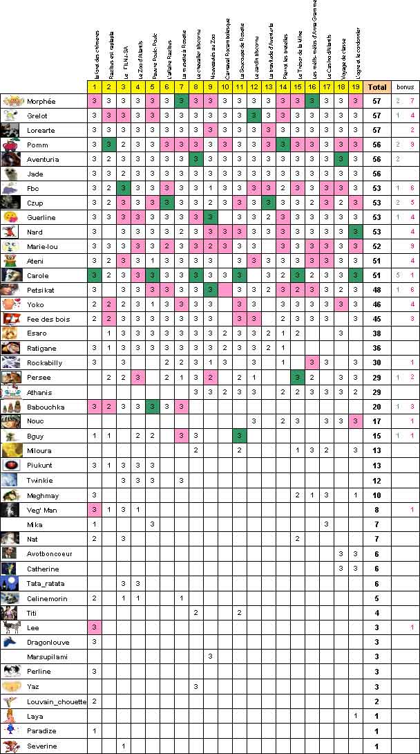 Pour ce qui est des "zoulies réponses", 2 ex aequo : Pomm et Marie-Lou qui ont bien failli atteindre la dizaine  |