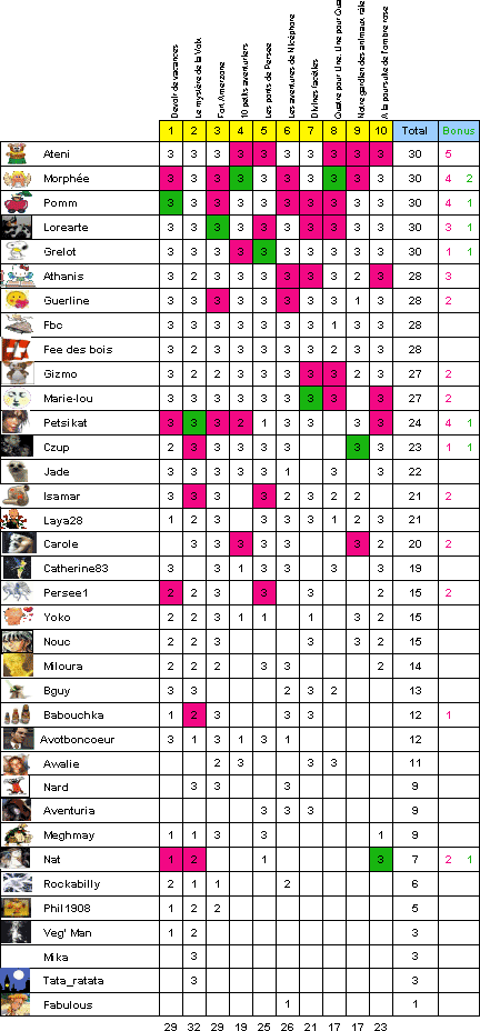 Après vérification, il s'avère que Nouc avait atteint le seuil des 20 stations, et mérite donc un deuxième point. Je suis désolé, j'ai du oublier une croix en recopiant vos réponses sur mon tableau. J'ai peur que tu doives corriger le tableau, Grelot...