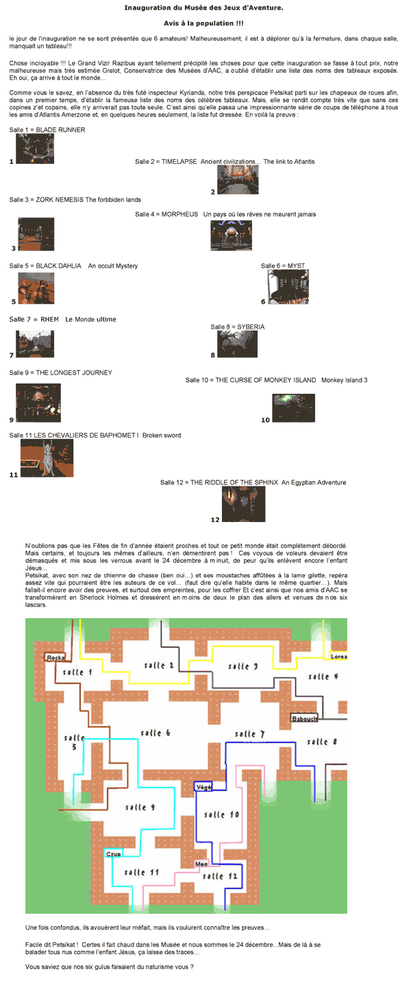 Et merci à notre maîtresse d'énigme pour ce beau voyage. Je ne connaissais que Blade Runner, Syberia, les Chevaliers et Myst! Maintenant, je recherche sur le net certains de ces jeux qui m'ont mis en appétit!!